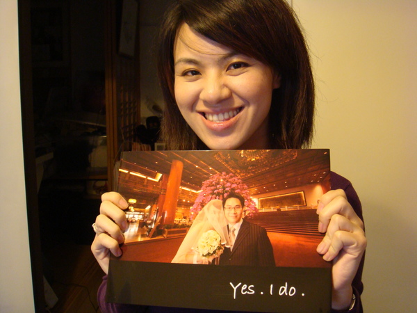 選擇的是精裝本,硬皮封面,而且還有加上書衣,放上康師傅拍的照片(不過也是有熱情的老公同事和學弟拍的喔^_^),將一輩子ㄧ次的回憶好好的蒐藏在相本裡。相簿主題採取和喜帖同樣的概念 Yes. I do.圓山飯店的大廳拍起來真的很有喜氣華麗的感覺。